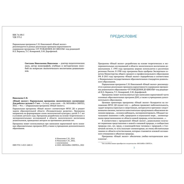 Юный эколог. Парциальная программа экологического воспитания. 3–7 лет. ФГОС. Николаева С. Н.