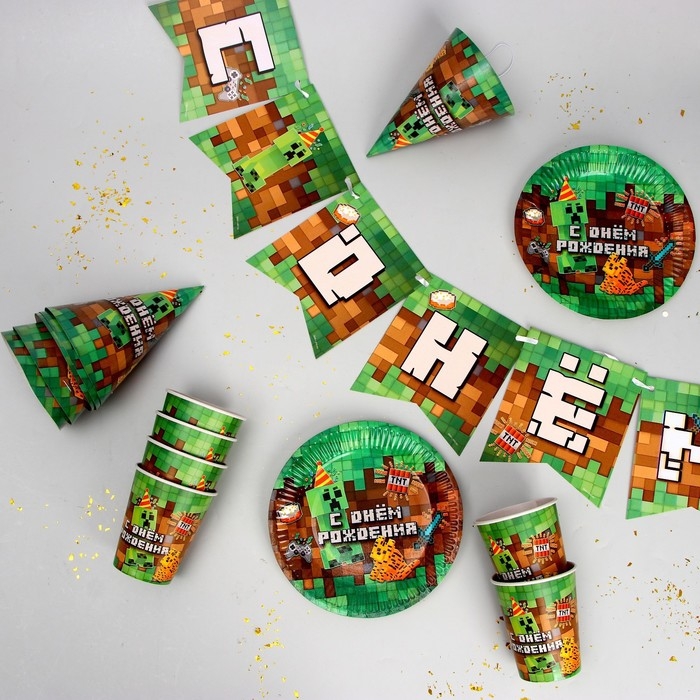 Набор бумажной посуды одноразовый С Днём Рождения», пиксели, 6 тарелок, 6 стаканов, 6 колпаков