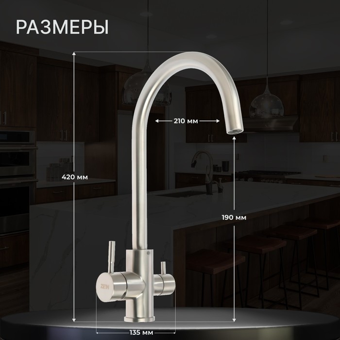 Смеситель для кухни ZEIN ZS 20101, с выходом для питьевой воды, нержавеющая сталь, сатин