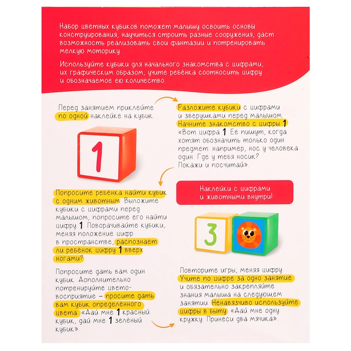 - Используйте кубики для начального знакомства с цифрами, их графическим образом, учите ребёнка соотносить цифру и обозначаемое ею количество.