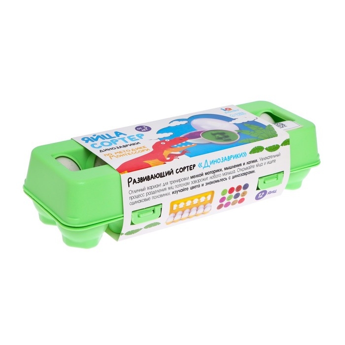 Внутри вы найдёте 12 яиц. Задача малыша — правильно подобрать и совместить половинки яиц с изображениями динозавров.