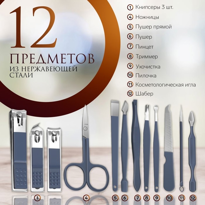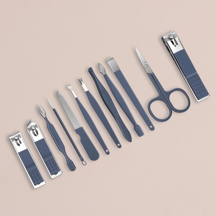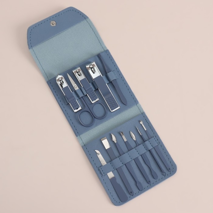 Набор маникюрный, 12 предметов, в футляре, цвет синий