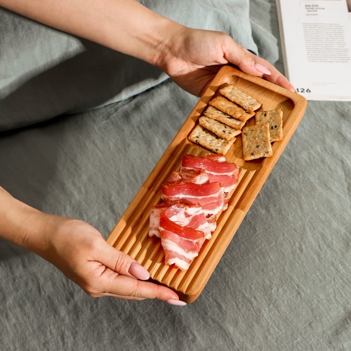Деревянная доска для сервировки подчеркнёт все достоинства вашего кулинарного шедевра и создаст атмосферу домашнего тепла. Подойдёт для подачи сырных и мясных нарезок, лёгких закусок, фруктовых канапе. Превратите обычный ужин в свидание в ресторане!