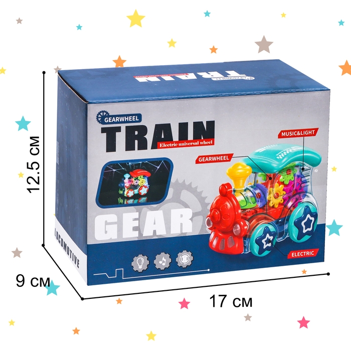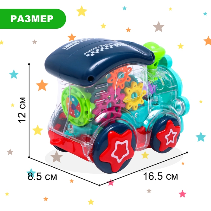 Паровоз «Шестерёнки» создан для маленьких любителей техники. Он самостоятельно катается по полу благодаря специальному моторчику на батарейках. Во время игры кузов светится и крутятся шестерёнки.