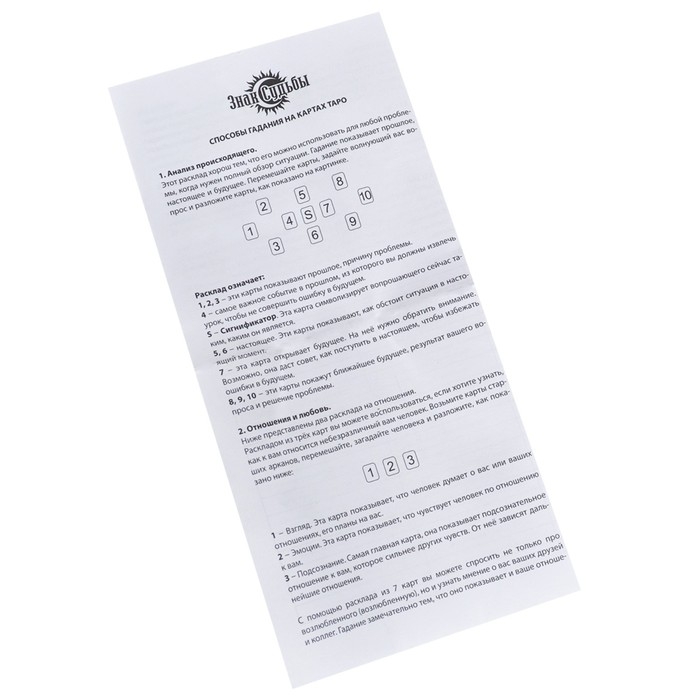 В плотной подарочной коробке Вы найдёте 22 старших (мажорных) аркана и 56 младших (минорных) арканов с инструкцией и описанием карт. Обучающие гадальные карты выполнены из качественного плотного картона, с яркой печатью.