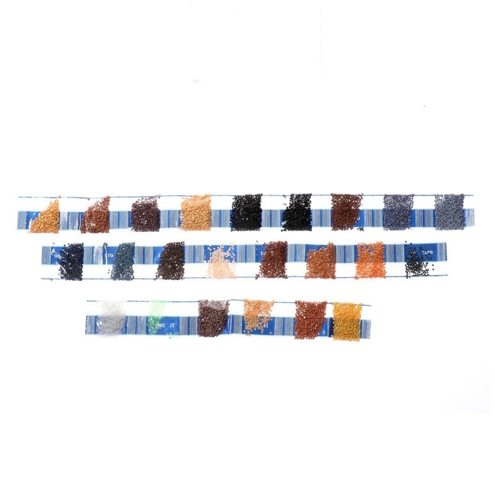 Разложите кристаллики с помощью карандаша по указанной схеме, заполнив полотно. На картине уже обозначены необходимые оттенки. Холст с клеевым покрытием будет надёжно удерживать стразы.