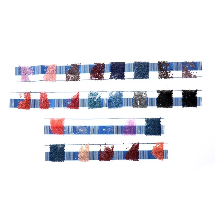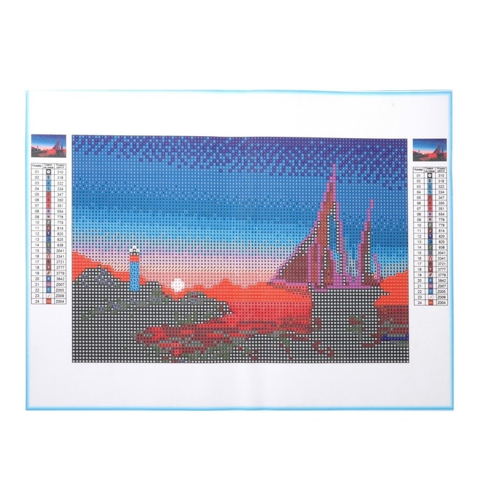 Разложите кристаллики с помощью карандаша по указанной схеме, заполнив полотно. На картине уже обозначены необходимые оттенки. Холст с клеевым покрытием будет надёжно удерживать стразы.