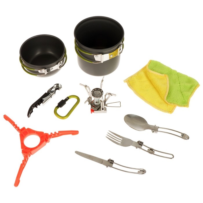 Набор туристической посуды Maclay: 2 кастрюли, приборы, горелка, штопор, тряпка, карабин