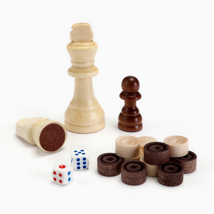 Шахматы, нарды, шашки 3 в 1 – это настольные игры, в которые могут играть как дети, так и взрослые, они могут быть использованы в качестве развивающей игрушки для детей, а для взрослых они могут стать увлекательным хобби. В набор входит: шахматная доска, шахматные фигуры покрытые лаком, у основания которых противоскользящая поверхность, фишки для игры в нарды, кости игральные 2 шт.