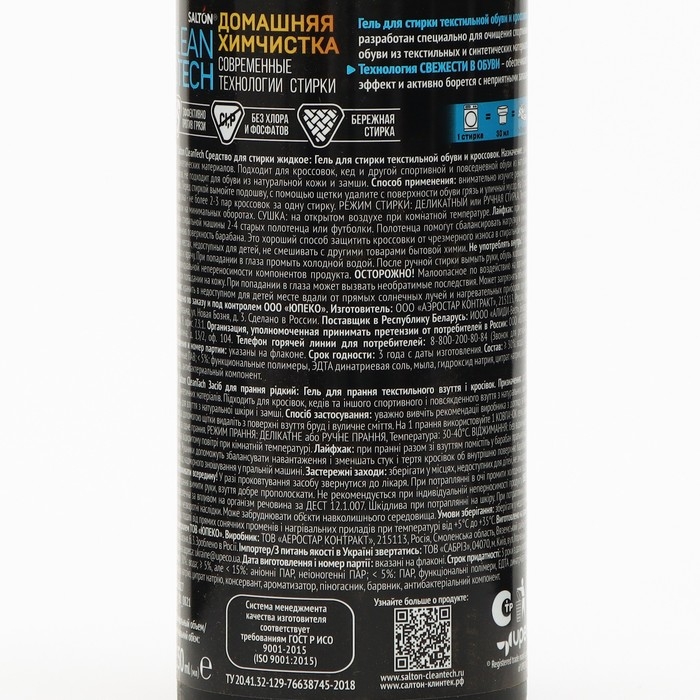 Гель для стирки текстильной обуви и кроссовок Salton CleanTech, 250 мл