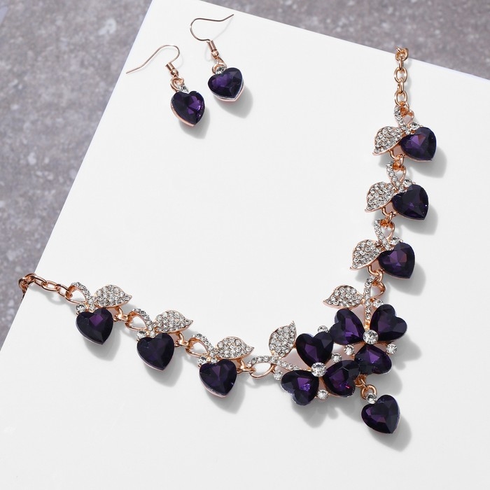 Набор 2 предмета: серьги, колье «Вернисаж» сердце и цветы, цвет бело-фиолетовый в золоте, 42 см