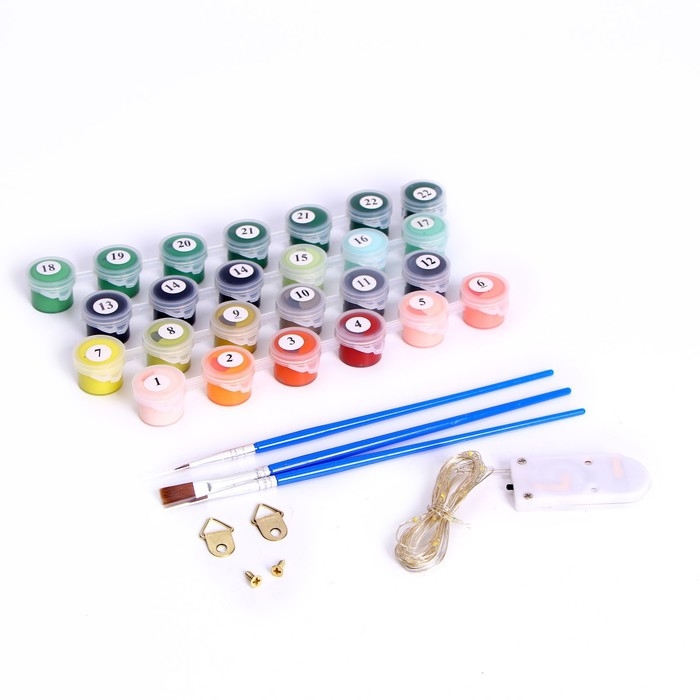 - В наборе есть гирлянда. Сделайте прорези в холсте шилом, где пожелаете, и вставьте лампочки. Эффектный ночник готов!