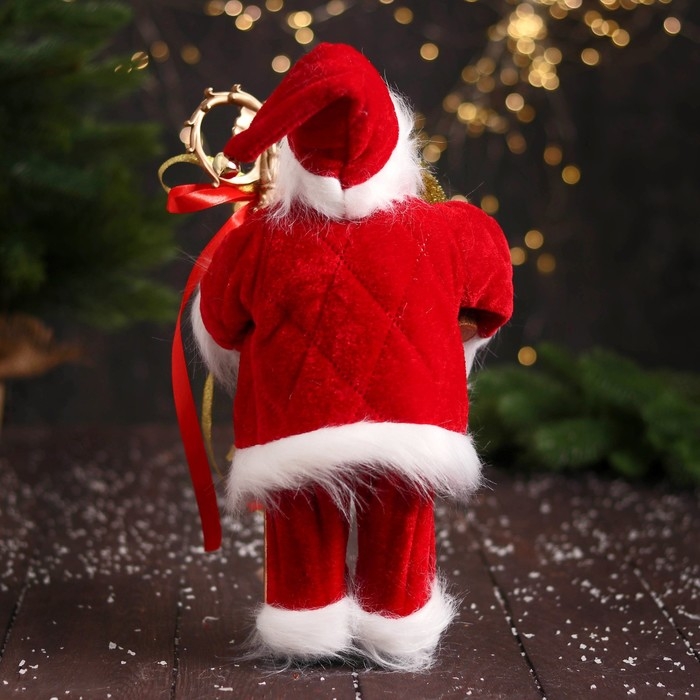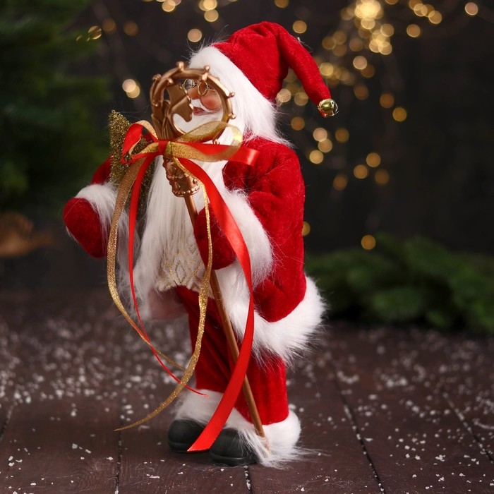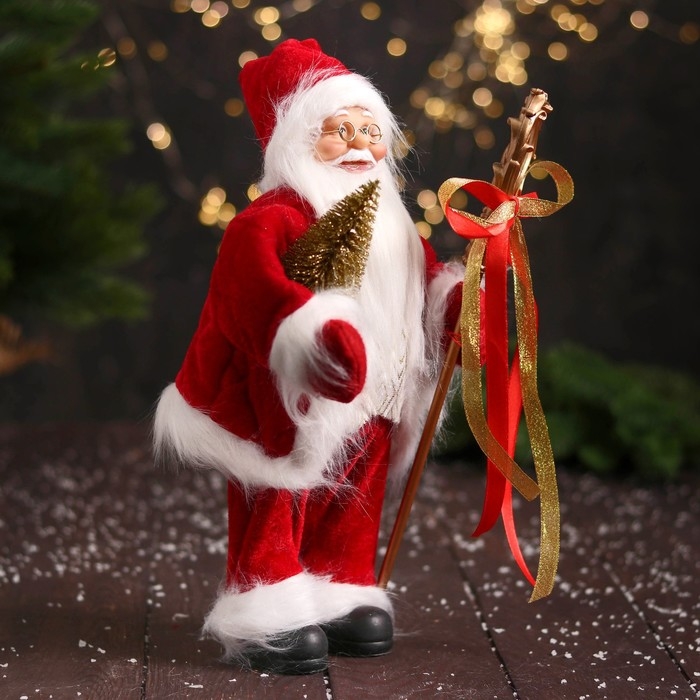 Дед Мороз " В кафтане с мехом и узорным посохом" 30 см, бело-красный