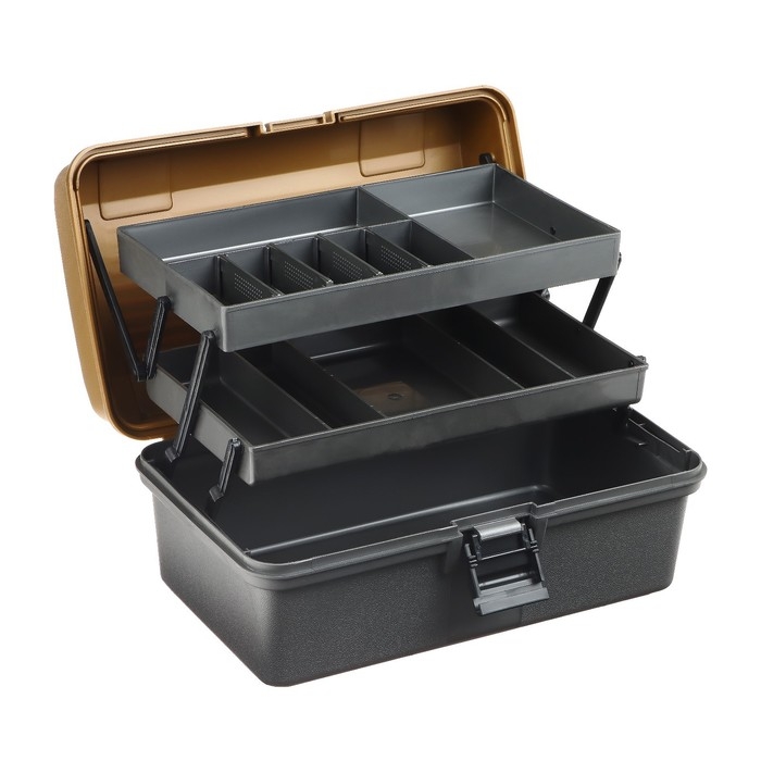 Удобный и вместительный ящик с двумя выдвижными полками для различной рыболовной оснастки: поплавков, приманок и другой полезной мелочи. На дно ящика можно положить 1-3 спиннинговых катушек.