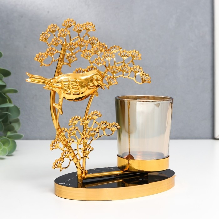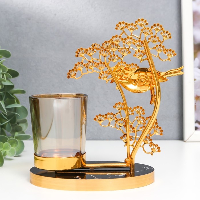 Подсвечник металл, стекло на 1 свечу "Птица на деревце" d-5 см, золото 8х15х17,5 см