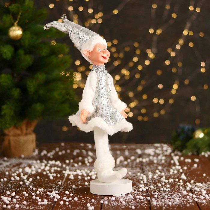 Новогодний шут "В узорном платье с мехом" 30 см, серебристо-белый