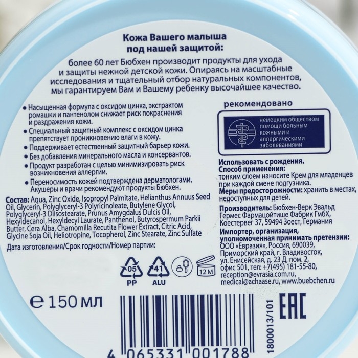 Крем для младенцев Bubchen под подгузник, 150 мл