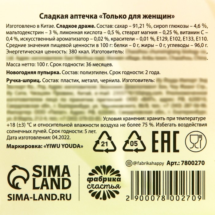 Сладкая аптечка «Только для женщин»: драже с витамином C, пупырка антистресс, ручка-шприц
