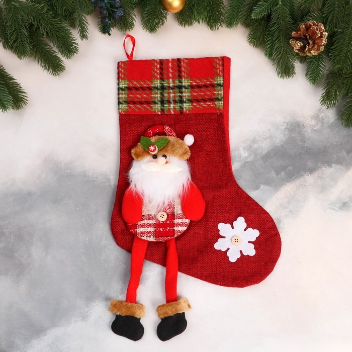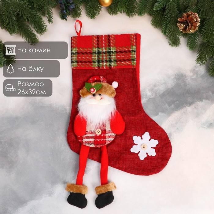 Носок для подарков "Дед Мороз с длинными ножками, снежинка" 26х39 см, красный