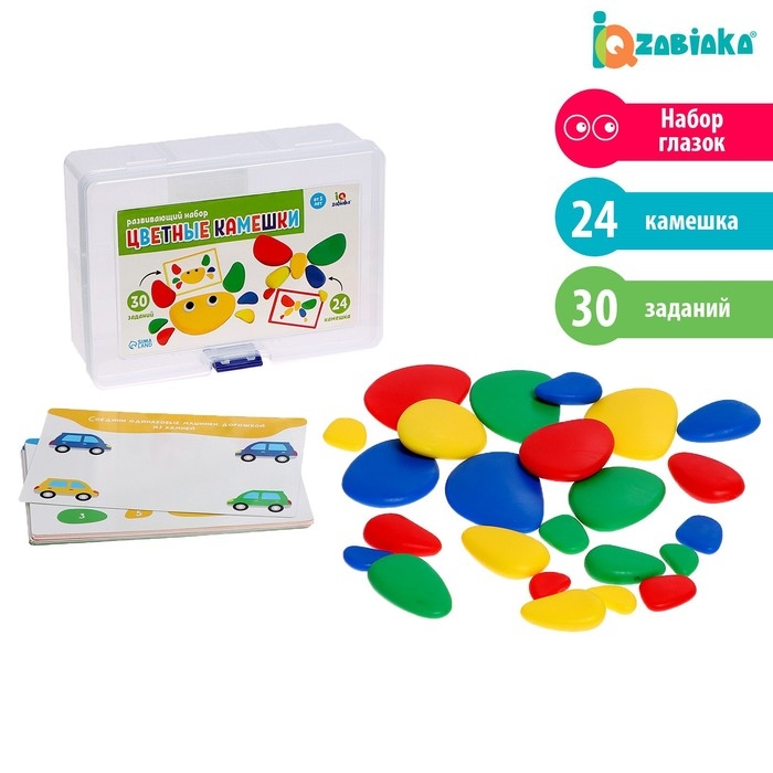 С развивающим набором «Цветные камешки» малыш потренирует внимание, память, логическое мышление и мелкую моторику. Внутри вы найдёте 24 камешка и 30 заданий.