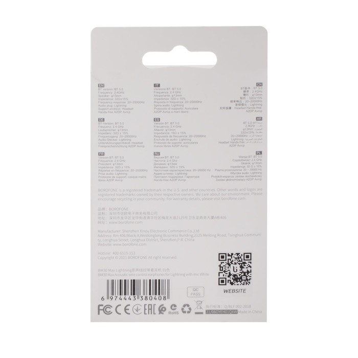 Наушники Borofone BM30 Max Acoustic, вкладыши, микрофон, Lightning, кабель 1.2 м, белые