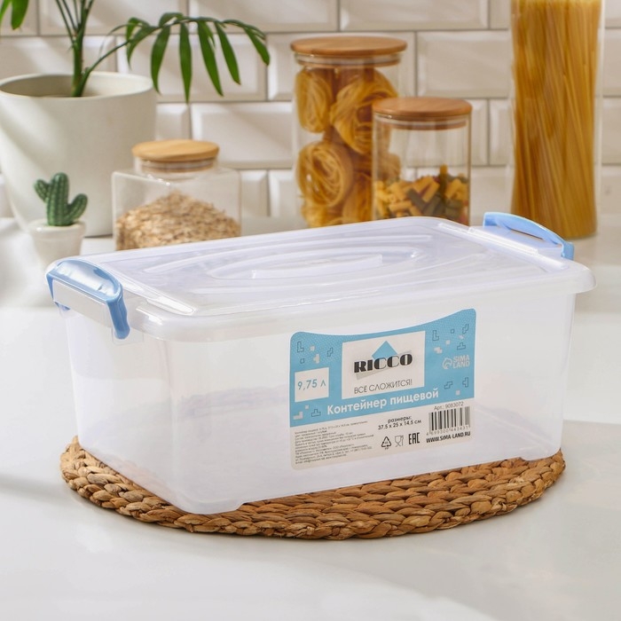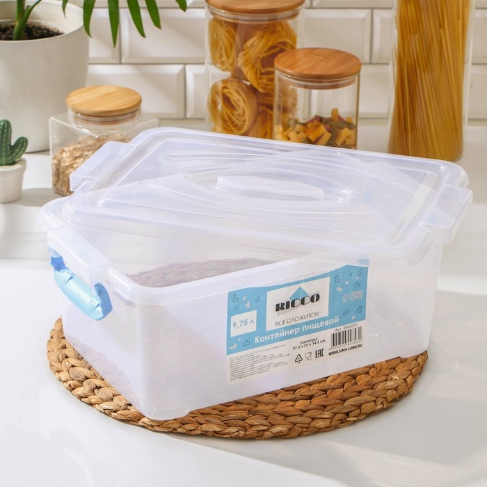 Контейнер пищевой RICCO, 9,75 л, 37,5×25×14 см, прямоугольный, цвет прозрачный, ручки голубые