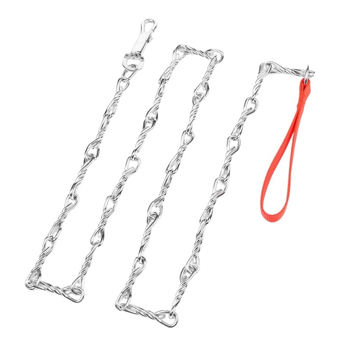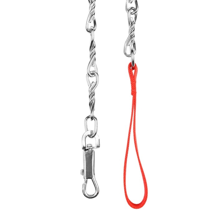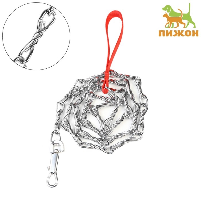 Поводок должен быть прочным и надежным. Металлический поводок полностью соответствует этим требованиям, плюс ко всему это красивый и износостойкий аксессуар. Поводок состоит из хромированной цепочки и мягкой нейлоновой ручки. Ручка прошита армированной нитью, удобно располагается в ладони и не натирает при натяжении. Поводок оснащен стальным карабином.