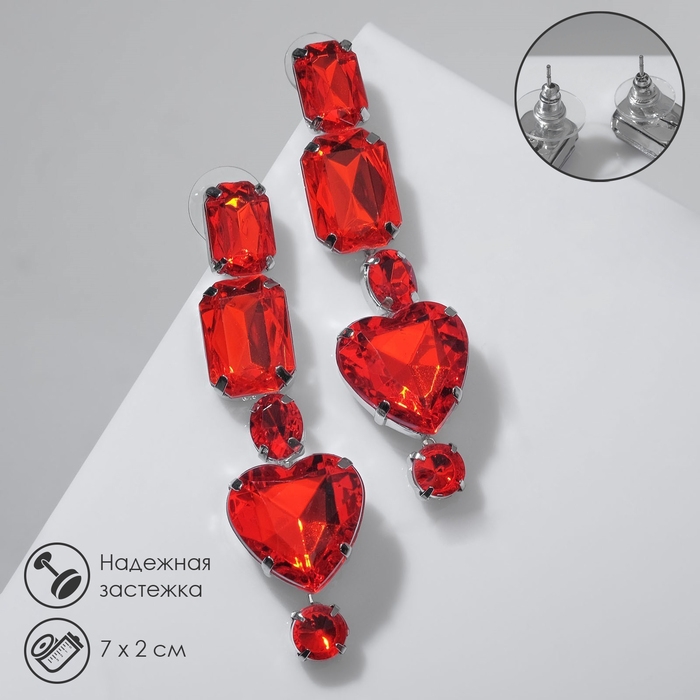 Серьги висячие со стразами «Драгоценность» сердце, цвет красный в серебре, 7см