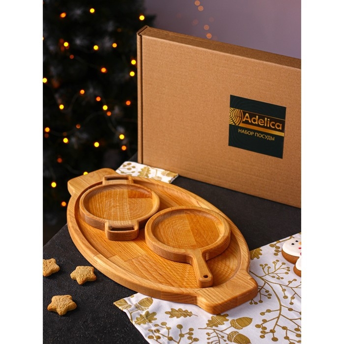Подарочный набор деревянной посуды Adelica, менажница 6 секций, менажница 2 секции, подставка для посуды, масло в подарок, берёза