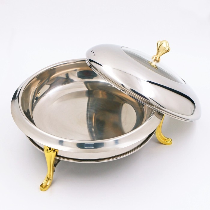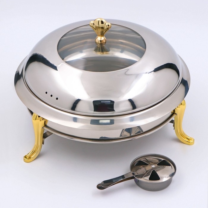 Мармит из нержавеющей стали круглый на подставке для подогрева, 26×22 см, стеклянная крышка