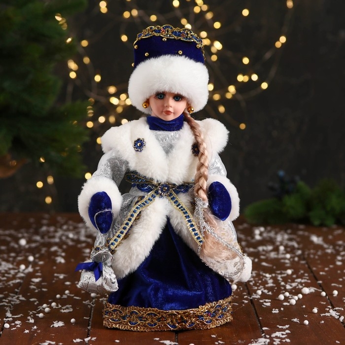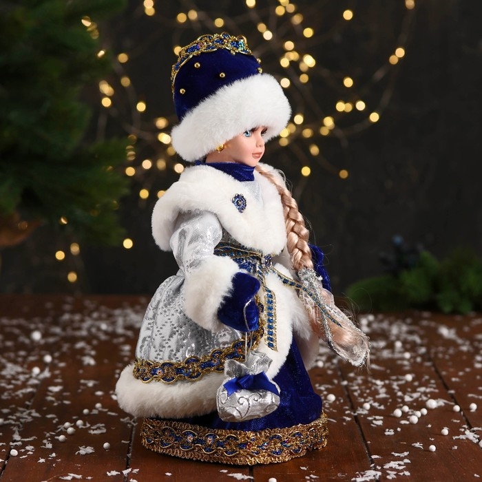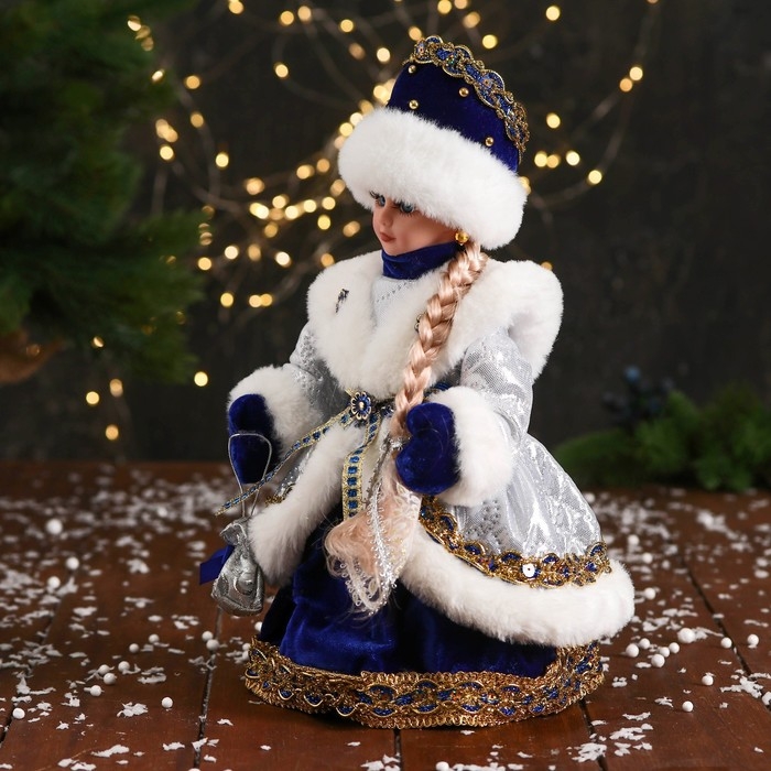Снегурочка "В меховом жилете с брошами" длинное платье, двигается, 30 см, серебристо-синий
