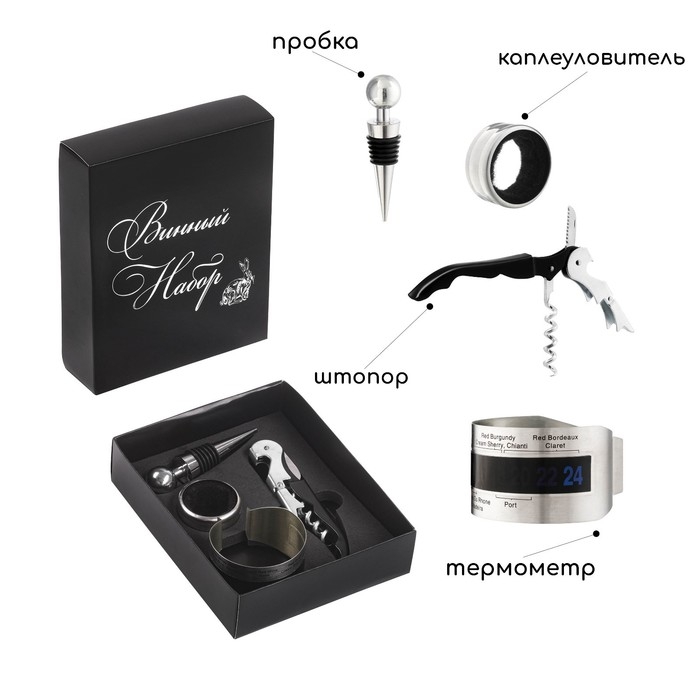 Набор для вина "Сомелье": штопор, термометр, каплеуловитель, пробка