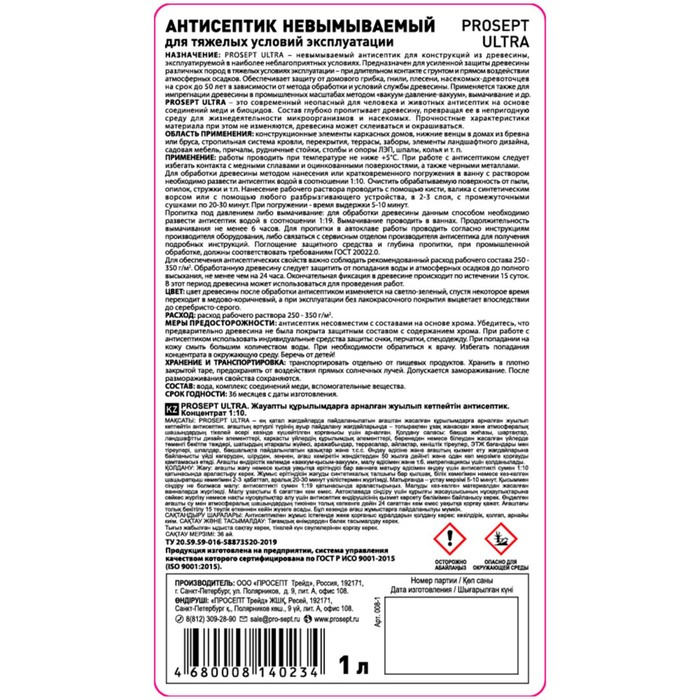 Антисептик невымываемый для ответственных конструкций Prosept Ultra. Концентрат, 1 л