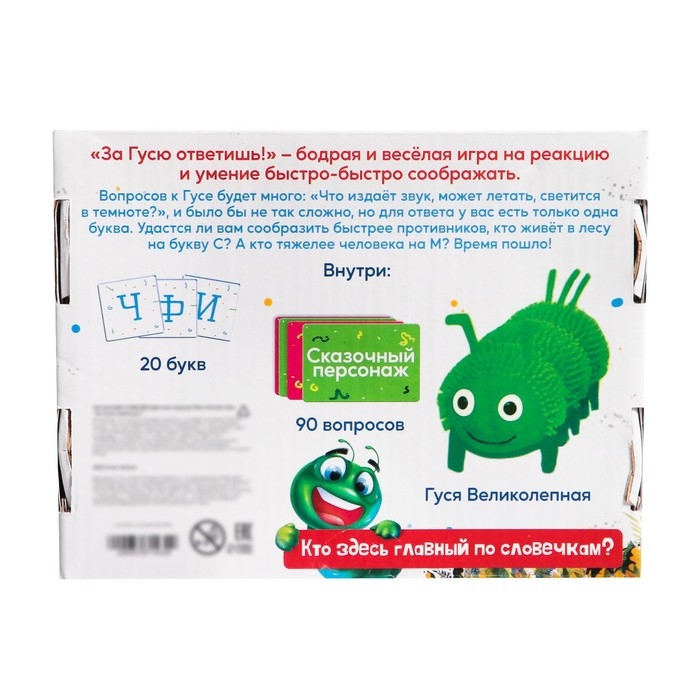 - Гусеница выступает в роли соревновательного элемента: она даёт право сказать свой ответ, без Гуси его не примут. Поэтому в игре понадобится не только словарный запас, но и умение быстро реагировать.