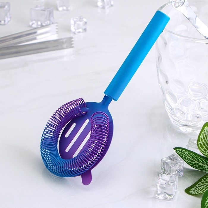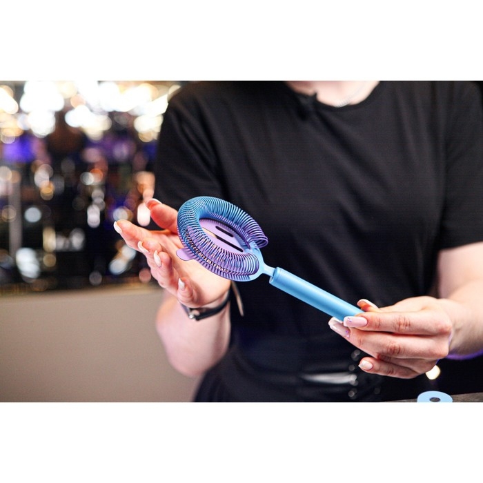 Основное отличие стрейнера от обычного ситечка — скрученная в пружину проволока. Благодаря ей крупные кусочки фруктов остаются в стрейнере, а мякоть и мелкие частички льда попадают в коктейль.