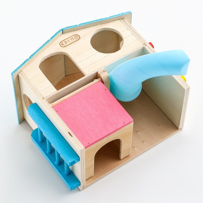 Домик также оснащен горкой, лесенкой и скалодромом для поддержания физического здоровья питомца.