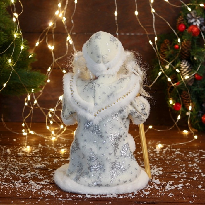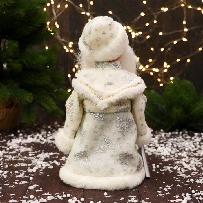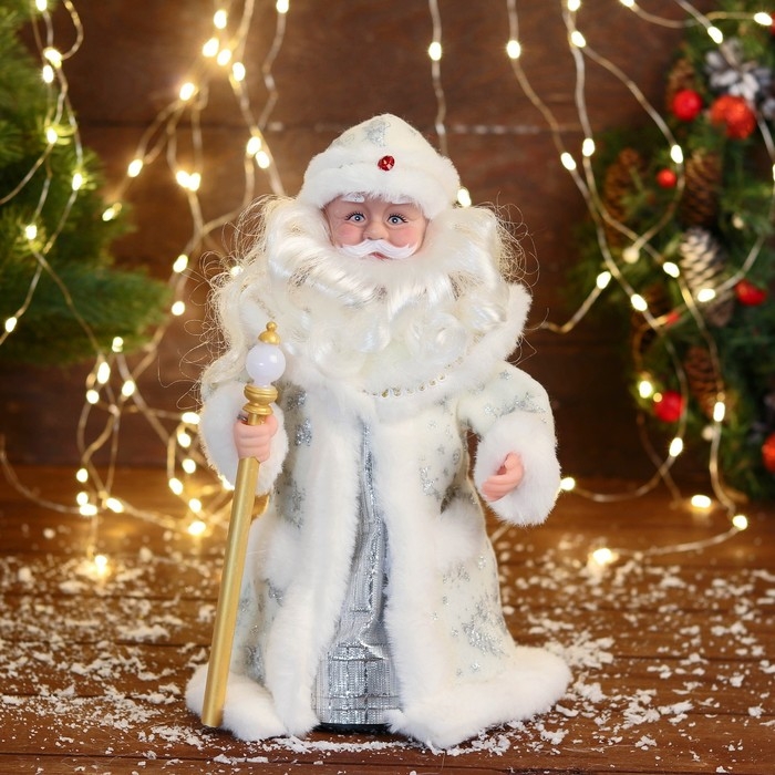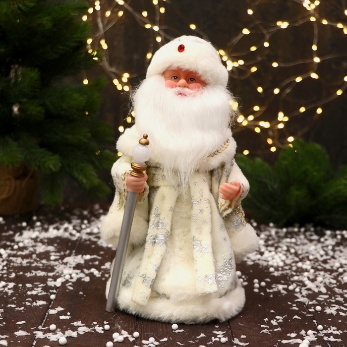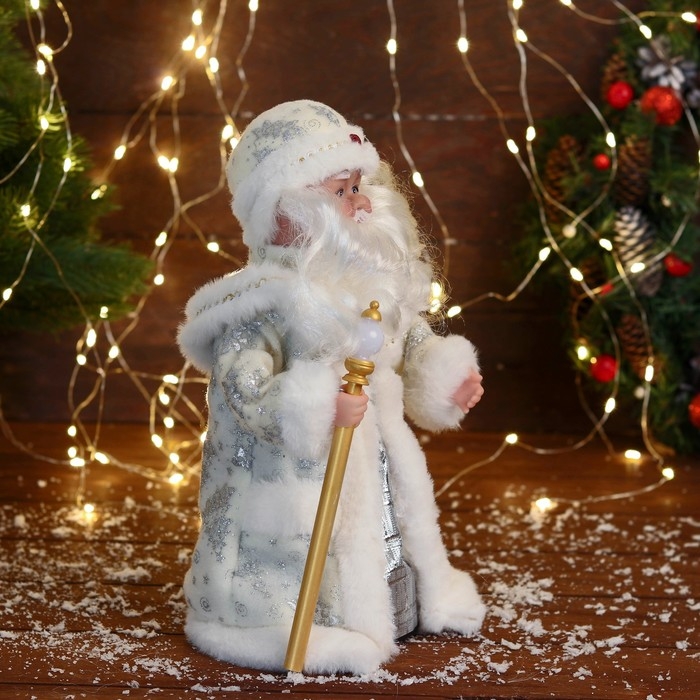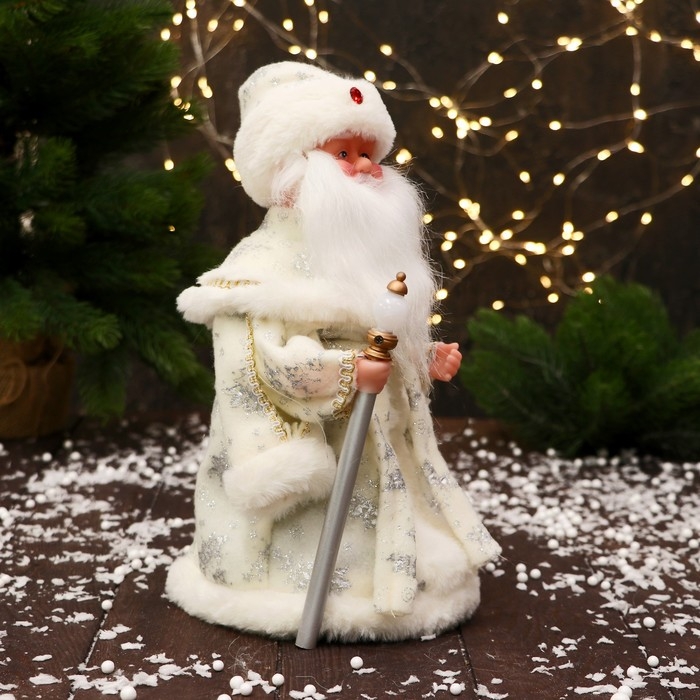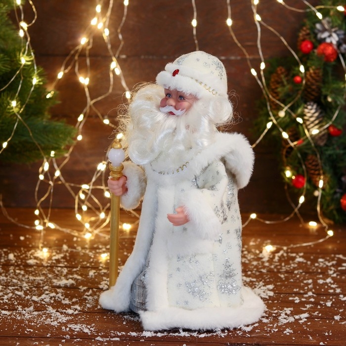 Дед Мороз "С фонариком на посохе и узорами на шубке" двигается, 30х14 см, белый