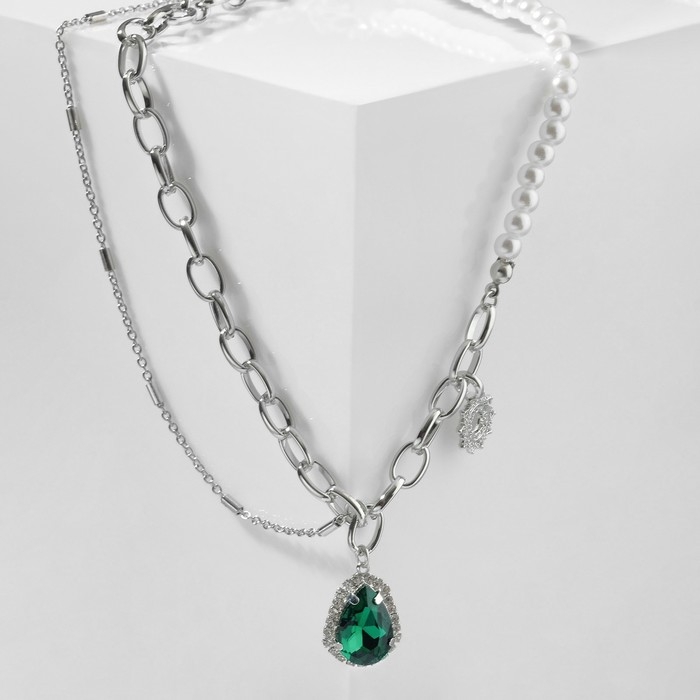 Колье «Капля» цветок, цвет бело-зелёный в серебре, 35 см