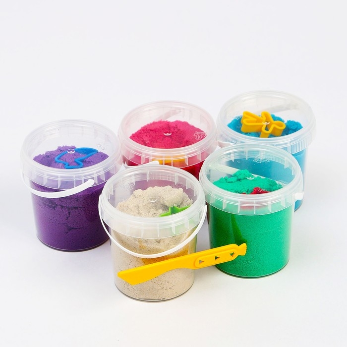 - В наборе 5 баночек песка разного цвета: зелёный, розовый, голубой, фиолетовый и песочный.