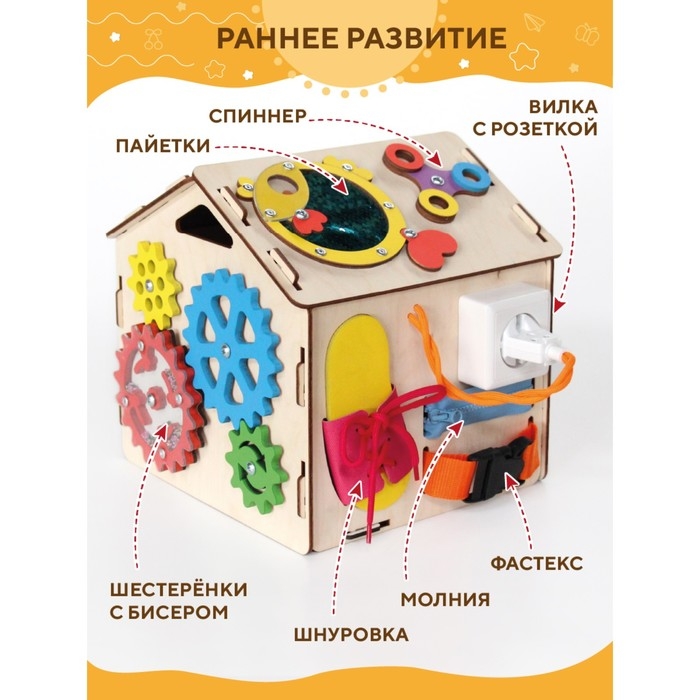 - Развивающие элементы: пазл, спиннер, пайетки, шестеренки с бисером, вилка с розеткой, молния, фастекс, дверцы, крючок, бусинки;