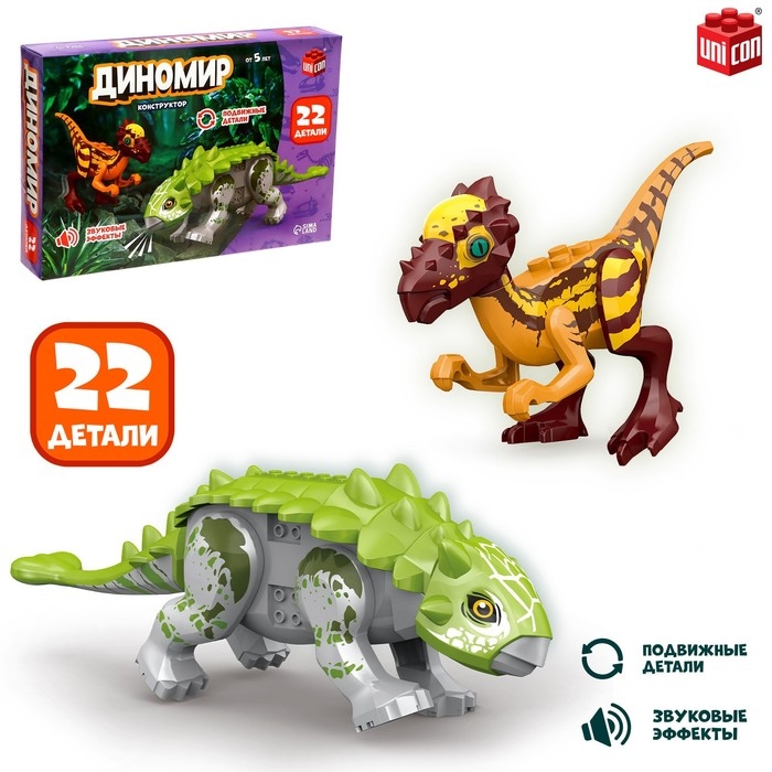 Конструктор «Диномир», 22 детали, тираннозавр и велоцираптор, звук