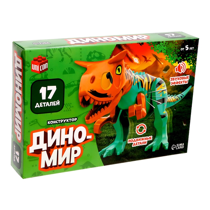 С конструктором «Диномир» ребёнок соберёт подвижную модель динозавра со звуковыми эффектами и окунётся в захватывающий мир доисторических гигантов!