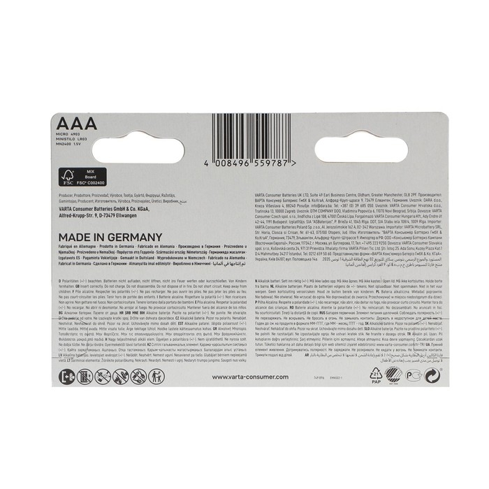 Батарейка алкалиновая Varta LongLife Power, AAA, LR03-8BL, 1.5В, блистер, 8 шт.