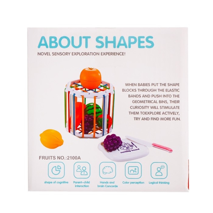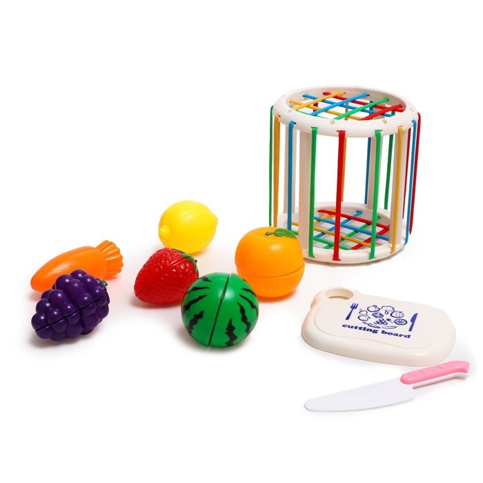- Детали сортера — фрукты и овощи, каждый можно легко поделить пополам пластиковым ножиком из комплекта и соединить обратно.