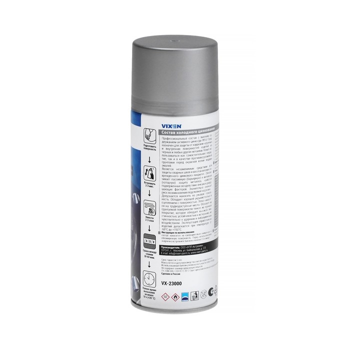 Состав холодного цинкования Vixen VX-23000 в виде аэрозольного баллона объемом 520 мл представляет собой защитное покрытие, предназначенное для предотвращения коррозии металлических поверхностей. Этот продукт содержит частицы цинка, которые при нанесении на металл образуют прочное и долговечное защитное покрытие, имитирующее свойства цинка.