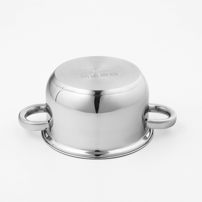 Кастрюля с крышкой из нержавеющей стали Доляна «Классика», 1,5 л, d=17,5 см, капульное дно имеет качественное трёхслойное капсулированное дно толщиной 1,1 мм (0,3 мм сталь/ 0,5 мм алюминий/ 0,3 мм сталь) и высокие стенки (толщина 0,3 мм). Они обеспечивают оптимальное распределение тепла по всей поверхности кастрюли, что препятствует пригоранию еды в процессе готовки. Используйте минимум масла и жира, сохраняйте максимальное количество полезных веществ и натуральный вкус продуктов.