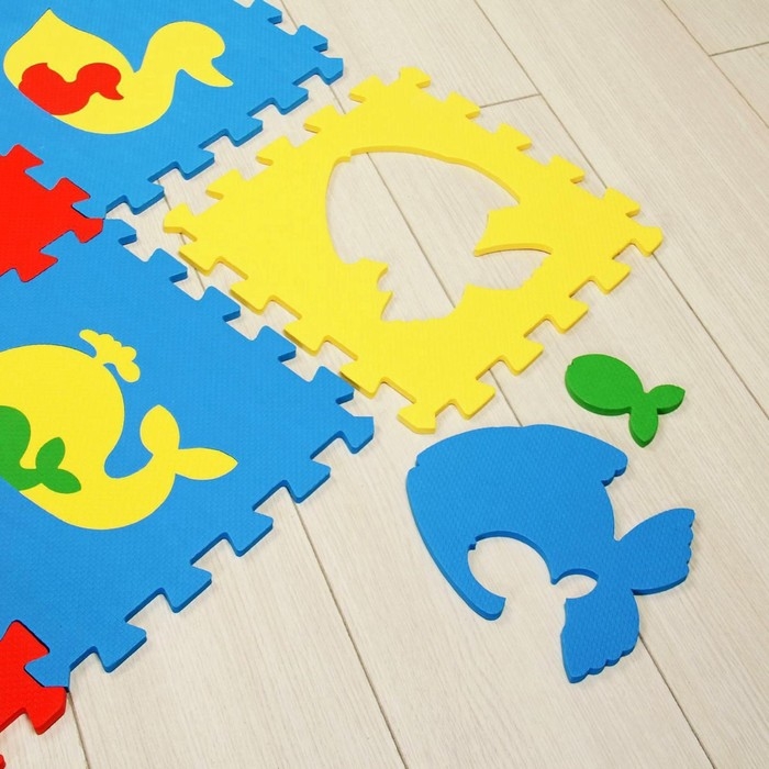 Вместе с этим покрытием покажите малышу новых зверей и их детёнышей. Каждый блок съёмный, вы можете вынимать элементы с животными поменьше и давать задание крохе: расставить их по местам.
