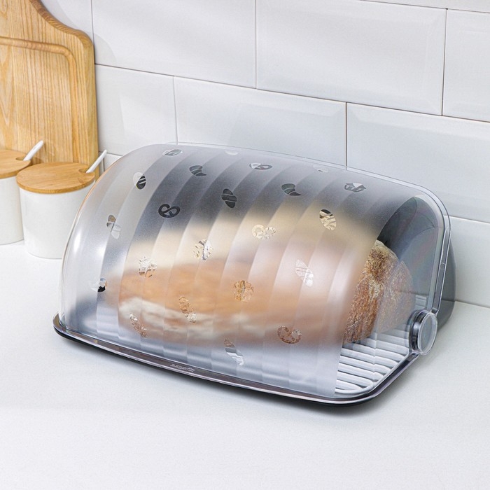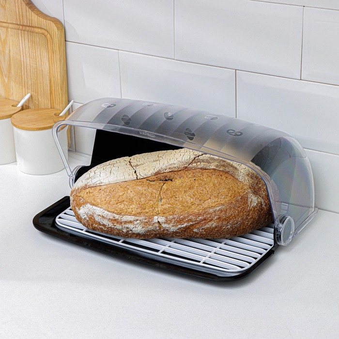 Хлебница изготовлена из пищевого белорусского пластика, в соответствии со всеми российскими стандартами качества. Внутри имеется специальный решетчатый поддон, что предотвращает налипание старых крошек на свежий хлеб и обеспечит достаточную вентиляцию.