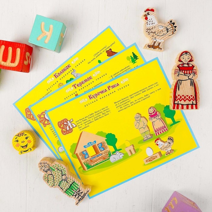 - В набор входят три сказки: «Колобок», «Курочка Ряба» и «Теремок», что позволяет разнообразить игровые сценарии.