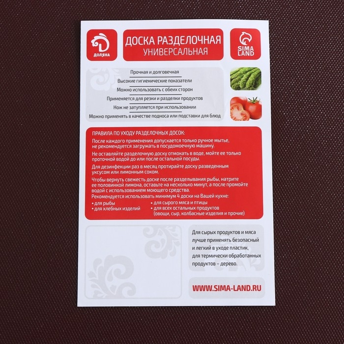 Поверхность доски твердая, не остается следов реза, в которых могут оставаться частицы продуктов питания. Доска проста в обслуживании (можно мыть любыми средствами или в посудомоечной машине). Она станет вашим надежным помощником в приготовлении вкуснейших блюд и прослужит вам верой и правдой много лет.